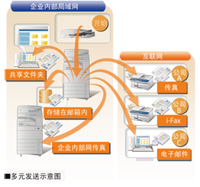 顾名思义,彩色多元发送的意思就是可以将扫描文档的电子文件同时发送到不同的应用程序或功能之上,以实现信息的同步传递和更新。例如,使用佳能智简彩色数码复合机的彩色多元发送功能,用户可将彩色图文资料扫描后,以电子邮件、互联网传真(i-fax)、Super G3传真等多种方式发往外部的不同终端,同时也可以发送给企业局域网中的共享文件夹、内部邮箱或者进行企业内部的局域网传真。扫描文档根据需求可以选择以TIFF、PDF、JPEG、XPS和OOMXL、高压缩PDF等多种文件格式进行传输。有了彩色多元发送功能,不仅让信息在瞬间被传递、共享,而且降低了通信费用及纸张费用。