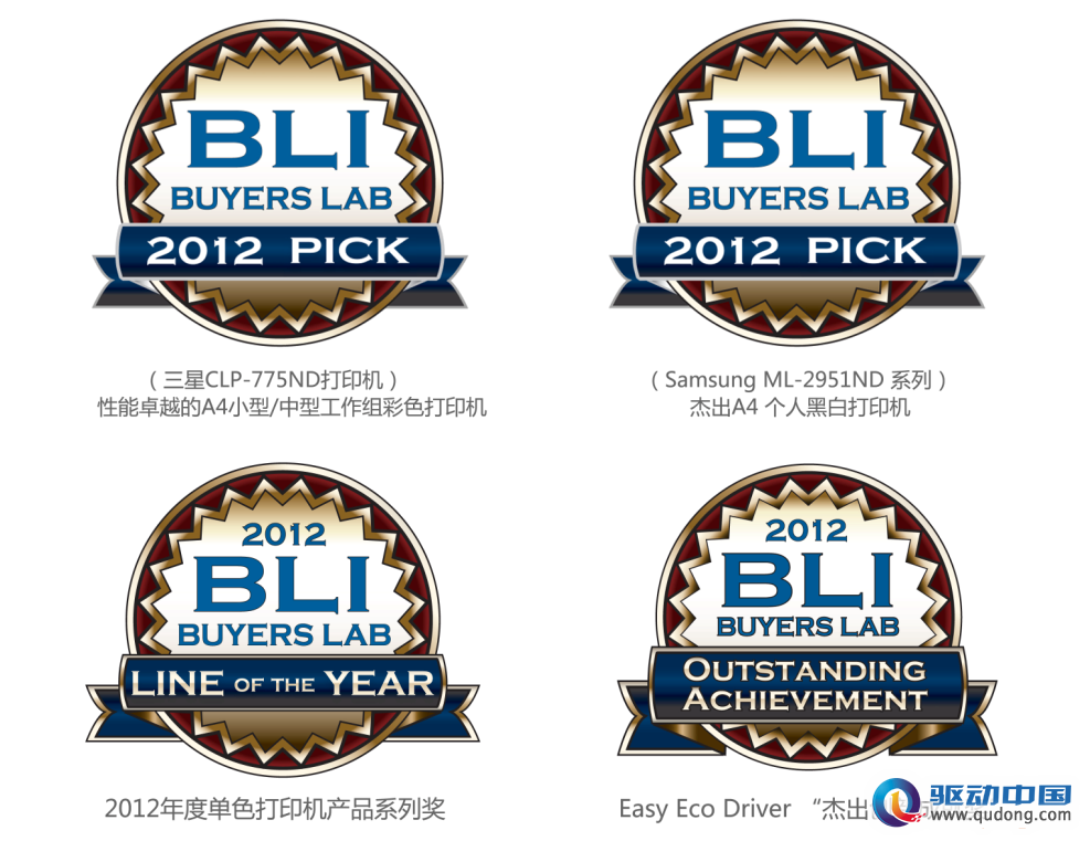 近日,全球著名的买家实验室(BLI)发布了最新的评测结果,三星数码打印产品以其卓越的性能表现,获得多项大奖。三星CLP-775ND、ML-2951ND分别在彩色打印机、黑白打印机类别中获得2012年冬季“年度之选”奖;三星独创的 Easy Eco Driver 环保驱动则被授予“杰出创新成就奖”;同时,由于产品系列拥有着良好的整体优势,BLI还特别授予三星电子有限公司“年度单色打印机产品系列”奖。