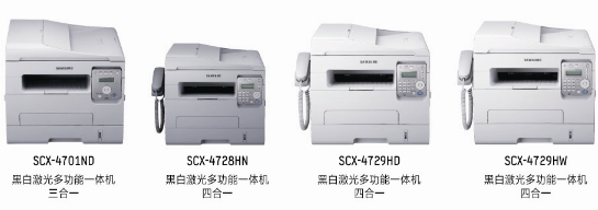 三星SCX-4701ND是一款集打印、复印和扫描为一体的3in1产品,而SCX-4728HN、SCX-4729HD和SCX-4729HW则是在打印、复印、扫描的基础上,增加了传真功能的4in1产品。为了迎合中国用户的使用习惯,三星特意在有传真功能的产品机身一侧配备了传真手柄,人性化的设计提高了用户的工作效率,也节省了额外购置外接电话的成本。