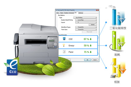 谈到企业的绿色环保,就不得不提到三星数码打印产品内置的环保驱动,通过环保驱动可以对图像或文字的明暗度进行调整,去掉粗体字,删除无用的图片和文档,以此来降低墨粉的消耗量,延长墨粉盒的使用寿命。环保驱动内置的结果模拟器,能够准确的显示每次打印时二氧化碳的排放量,以及纸张和电能的消耗情况,让用户更加直观的了解每次打印的环保指数,从而更加长效的减少企业的运营成本。