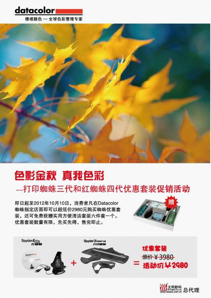 参加本次促销活动的优惠套装是Spyder4Elite红蜘蛛四代和Spyder3Print SR™打印蜘蛛三代。从显示器到打印机色彩校正,确保你获得真实一致的色彩。让你轻松享受色影金秋,真我色彩!