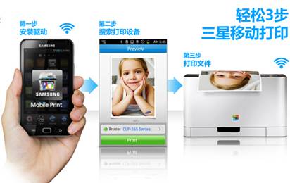 CLP-366W还能让拥有Android或IOS智能系统的移动终端设备能够随时实现移动办公。无论是手机还是平板电脑,只需轻松三步,就能实现Wi-Fi打印。第一步,在移动终端设备中下载Samsung Mobile Print打印应用程序,第二步通过Wi-Fi接入点进行无线连接,系统能够自动检测到兼容的三星打印机,第三步当然就可以立即开始打印文件。