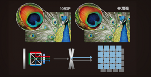*1 4K增强技术使像素点沿对角线方向位移0.5个像素,分辨率翻倍达到3840x2160,清晰度超越了全高清的图像质量。在3D模式下的分辨率仍为1920x1080。