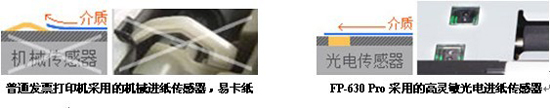 普通的发票打印机大多采用机械传感器检测纸张进纸,而机械进纸传感器突起的支柄有可能会成为纸张进入打印机的阻碍,导致卡纸现象的发生,这样会大大降低工作效率,同时在处理卡纸时也可能损坏打印机。映美FP-630 Pro摒弃了普通平推打印机的机械传感装置,而是采用了高端打印机才配备的高灵敏光电进纸传感器,不会产生阻挡问题,保障了进纸畅通无碍。