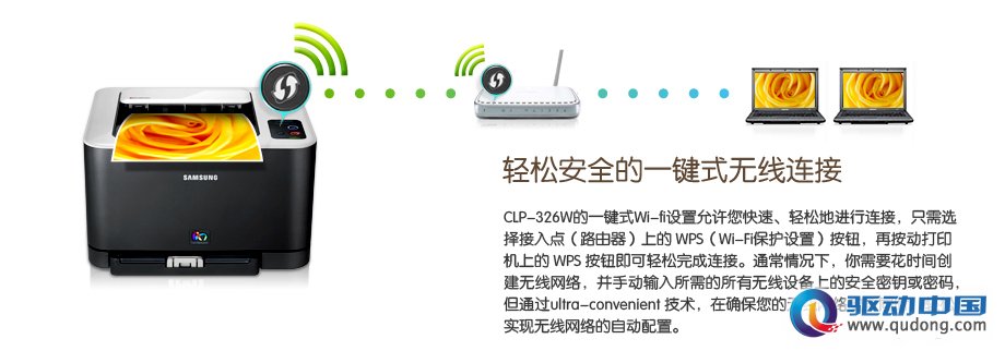 要在市面上如此众多的Wi-Fi无线打印机产品中脱颖而出,三星Wi-Fi无线打印产品自然有它与众不同之处。在三星Wi-Fi产品的机身上都设有一键式WPS按键,比如三星ML-1865W和SCX-3206W,只需轻触这一按键,然后再按下路由器接入点上的WPS按键即可完成网络连接。一键式Wi-Fi设置功能节省了以前建立无线网络名称,并手动输入所有无线设备安全密码所需花费的大量时间。
