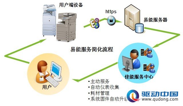 目前,“易能”适用用户主要是已经在使用MG服务和使用佳能数码复合机产品的企业用户。“易能”服务通过互联网来连接设备和服务器,可以为终端用户提供故障监测、远程抄表、耗材余量提示,CDS系统固件自动升级等四方面的主动服务。