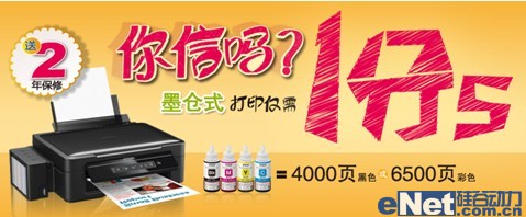 由爱普生率先研制推出的墨仓式打印机,是一种全新的打印机品类。这种新型打印机,不同于目前广泛使用的激光打印机和传统喷墨打印机,其打破了市场上“正品”、“原装”即代表“高成本”的固有思维,将打印成本降低到一个前所未有的程度,真正实现了成本的突破。爱普生全新墨仓式打印机,标配超大容量墨水,每瓶70ml,可实现黑色4000页或彩色6500页的海量打印,而每瓶墨水的市场报价仅为60元。按此算来,黑色单张成本为1分5,彩色也才4分3,比灌粉或改装连供的打印成本更低。此外,墨仓式系列打印机均采用爱普生特有的微压电打印技术,不仅保证了打印机的工作稳定性,而且打印头经久耐用,不是耗材,可与整机同样享受原厂的保修服务,不仅省钱,还省心省力。并且,目前正值促销期,购买墨仓式打印机并上网注册,可以享受长达2年的保修。