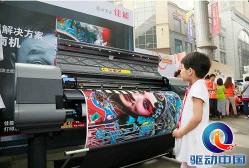 小朋友在佳能大幅面打印机前观看色彩绚丽的打印效果