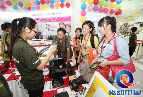 在佳能全系列影像产品展区佳能工作人员在引导乐拍组参赛选手体验佳能产品